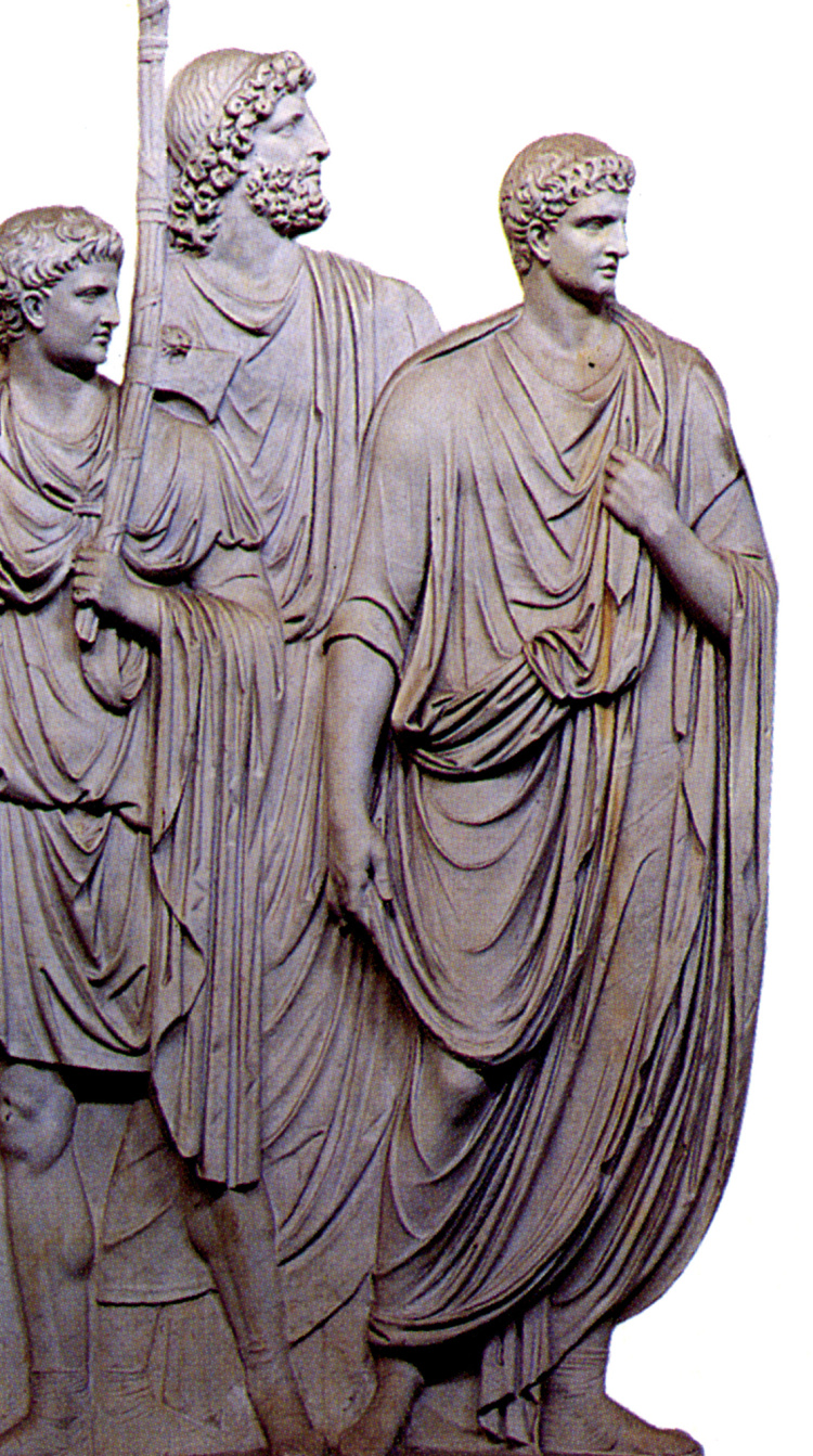从《罗马十二帝王传》中的描述可知,托加长袍首先是罗马公民与外来者的区别标志,其次是罗马官员的正式穿着,最后,托加长袍上的边饰还能代表罗马高级官员的特殊地位,这已然让镶边托加长袍具备了基础的官服职能。