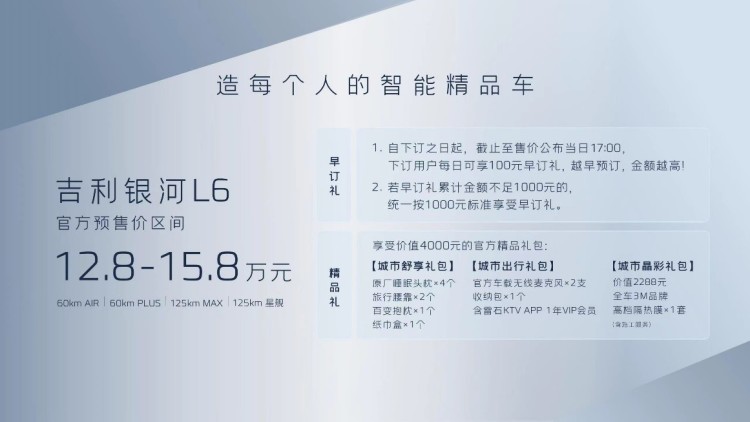 【环球网汽车综合报道】8月25日,吉利银河L6在成都车展正式开启预售,推出纯电续航60km AIR、60km PLUS、125km MAX和125km星舰四款车型,预售价区间为12.8~15.8万元,用户可以直接在吉利银河APP或小程序进行下订。在诚意十足的价格基础上,吉利银河L6还为用户推出丰厚的预订权益,凡是在预售期内下订并支付600元意向金的用户,即可享受两重礼: