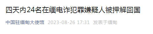 据中国驻缅甸大使馆微信公众号26日消息,8月26日,又有5名电信诈骗犯罪嫌疑人在仰光国际机场由缅甸警方移交给中国警方工作组押解回国。 至此,在四天时间内共24名电诈犯罪嫌疑人被押解回国。 此次行动彰显了中方同缅甸等相关方联合打击诈赌犯罪的坚定立场。各方将以更紧密的合作、更主动的攻势、更专业的行动,严厉打击本区域诈赌犯罪。