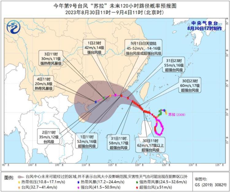 中央气象台8月30日12时对“苏拉”的路径和强度预报