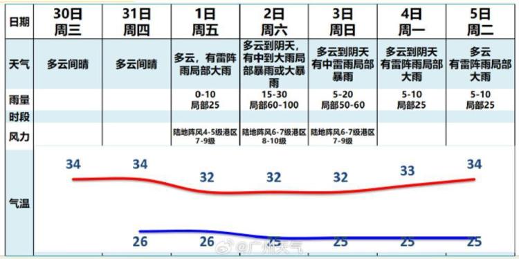 根据广州市气象台8月30日上午会商预报,广州市区8月30日至8月31日维持多云间晴天气。9月1日起,预计广州风雨将转明显,其中9月1日广州市区多云有雷阵雨局部大雨,9月2日多云到阴天有中到大雨局部暴雨或大暴雨,9月3日多云到阴天有中雷雨局部暴雨;预计9月1日广州陆地阵风4~5级港区7~9级,9月2日进一步加大至陆地阵风6~7级港区8~10级,9月3日广州陆地阵风仍有6~7级港区略减弱至7~9级。
