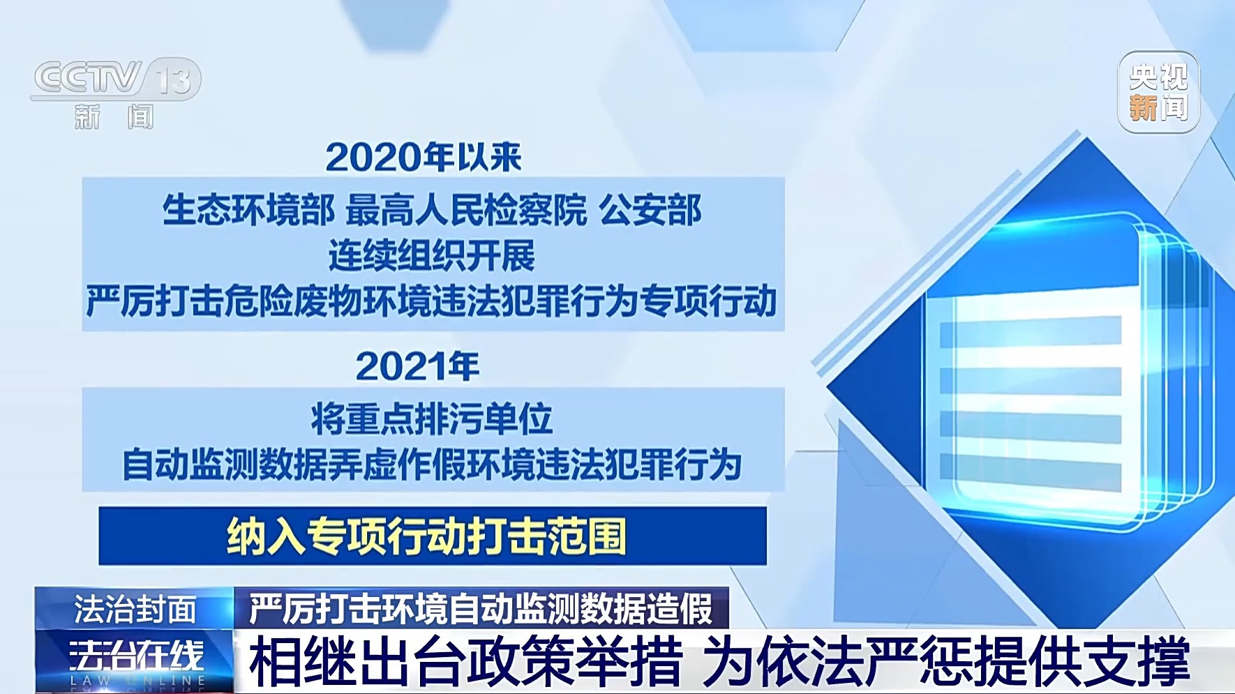 2020年以来,生态环境部、最高人民检察院、公安部连续组织开展严厉打击危险废物环境违法犯罪行为专项行动,2021年将重点排污单位自动监测数据弄虚作假环境违法犯罪行为,纳入专项行动打击范围。