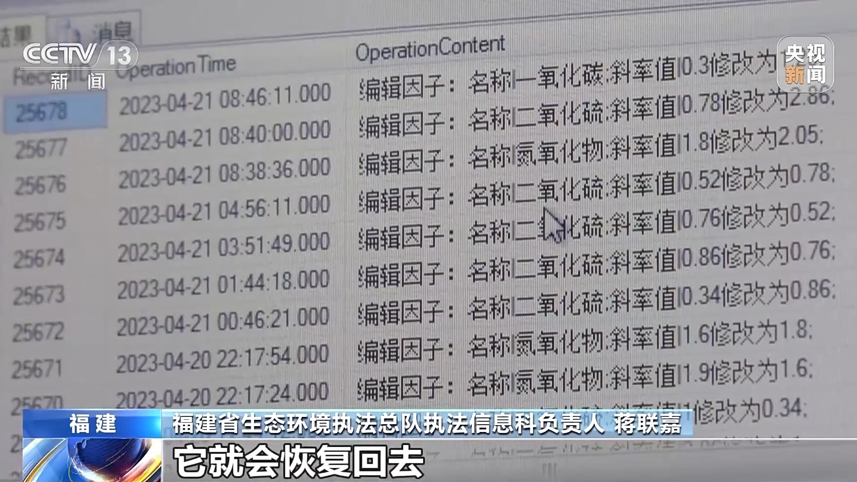 福建省生态环境执法总队执法信息科负责人 蒋联嘉:4月20日16点56分37秒,它把二氧化硫的斜率值,从2.86修改为1,那就是说,测出来原来是286毫克每立方米,那它因为这个斜率值被修改后,显示出来就变成100,浓度值降低很多了。最后一条修改日志,它把0.78修改成2.86,就是为了防止被发现,它会恢复回去。