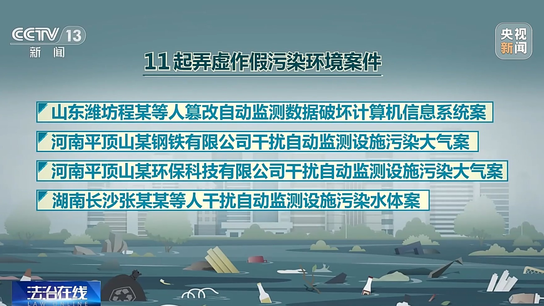 这11起案件分别为:北京通州李某等人篡改自动监测数据污染大气案、辽宁朝阳许某某等人干扰自动监测设施污染水体案、上海嘉定范某某等人篡改自动监测数据污染水体案、江苏无锡某纸业有限公司干扰自动监测设施污染水体案、山东潍坊程某等人篡改自动监测数据破坏计算机信息系统案、河南平顶山某钢铁有限公司干扰自动监测设施污染大气案、河南平顶山某环保科技有限公司干扰自动监测设施污染大气案、湖南长沙张某某等人干扰自动监测设施污染水体案、重庆綦江谭某等人干扰自动监测设施污染水体案、重庆梁平陶某某等人干扰自动监测设施污染水体案、贵州遵义杨某某等人干扰自动监测设施污染水体案。