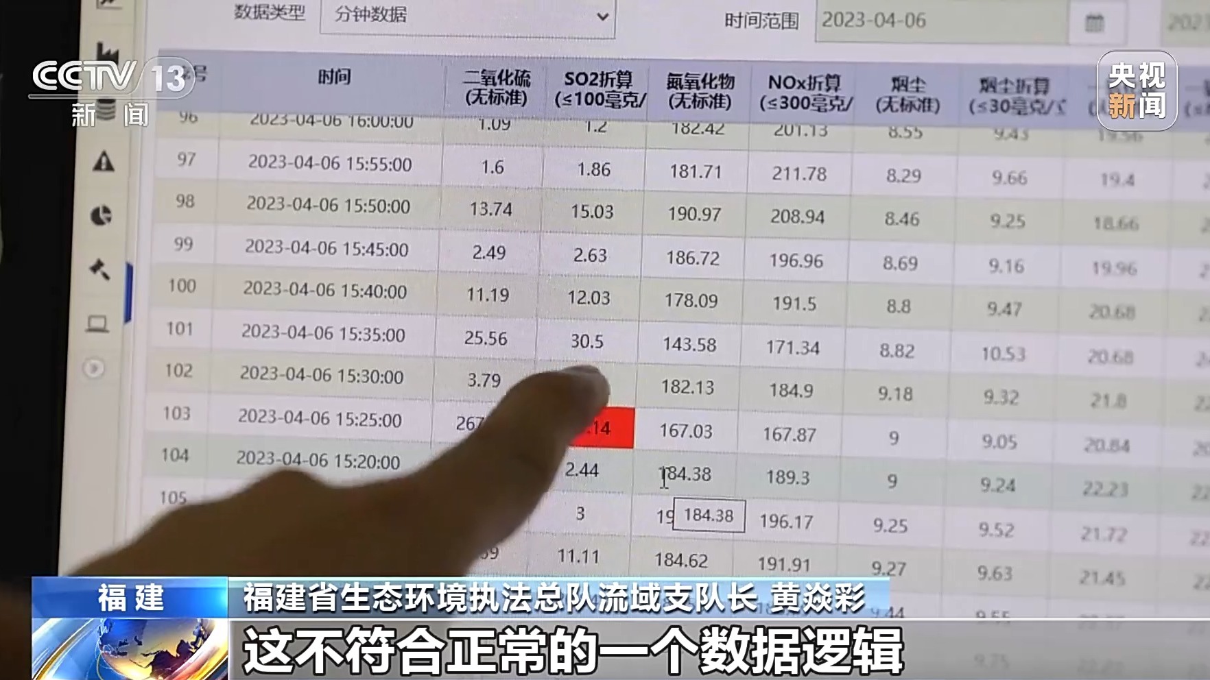 福建省生态环境执法总队流域支队长 黄焱彩:我们以这一个时间段为例,4月6日3:25,它的二氧化硫自动监测结果是269,但是它前后时段,因为是五分钟测一次,它的变化太剧烈,二点几和三点几,这不符合正常的一个数据逻辑。这是不正常的,因为它的原材料在这一个阶段,应该是一模一样的,那工艺又没有发生变化,它出现这个数值变化,它造假的概率,或者说是人为篡改参数的概率就超过80%。