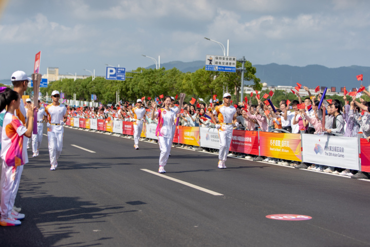 9月14日,杭州亚运会火炬传递台州站现场,市民为火炬手加油喝彩。记者 朱海伟 吕之遥 潘海松 摄