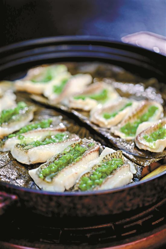 青姜蓉不是“青色的姜”,所谓的青色是来自生葱的绿色,其实应该叫“碧绿姜蓉”更妥帖一些。爆香料头的同时,将起好片的鱼肉摆放在荷叶上,每片鱼肉铺上一小勺青姜蓉,“一面听着滋滋作响的人间烟火,一边看鱼肉受热膨胀舒展的变化,也很有观赏效果。”曹师傅边操作边介绍道。