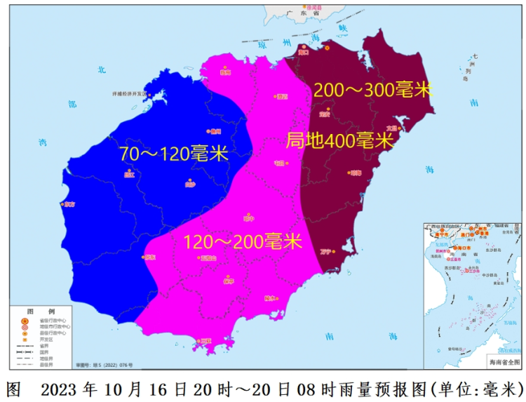 各地累积雨量(10月16日20时—20日08时):海口、文昌、定安、琼海和万宁等市县200~300毫米、局地400毫米,临高、澄迈、屯昌、琼中、五指山、乐东、保亭、陵水和三亚等市县120~200毫米,其余市县70~120毫米。
