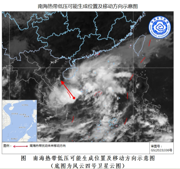 目前,南海西部海面有热带扰动发展,预计该热带扰动将向西偏北方向移动,逐渐趋向海南岛西南部近海、北部湾海面,有可能于24小时内加强为热带低压。