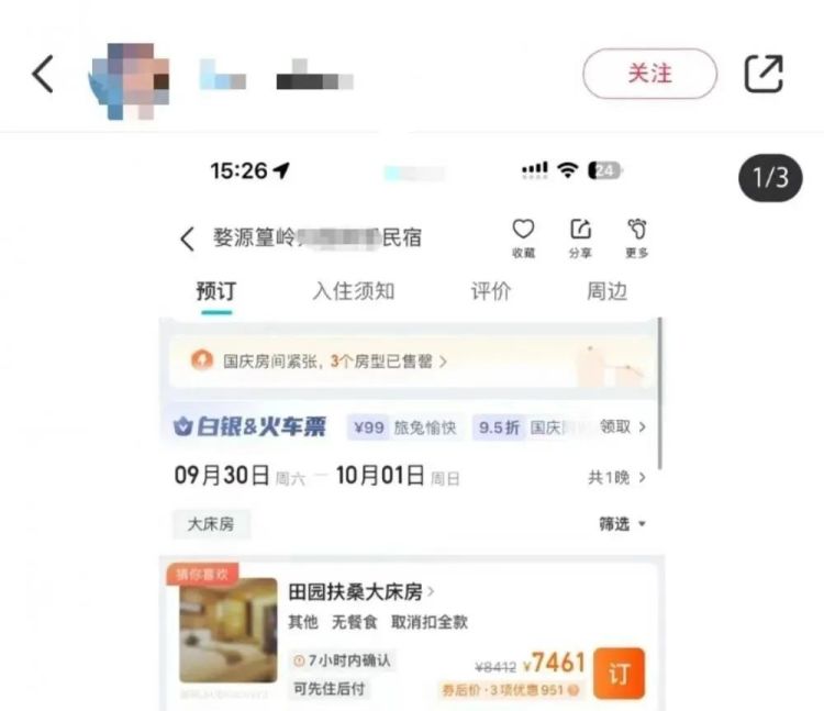 9月26日上午,有网友发帖吐槽称,江西婺源篁岭某平时标间仅117元的民宿价格在9月30日涨至7461元,暴涨六十多倍。