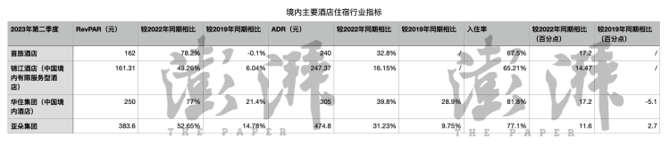 此前,澎湃新闻梳理主要酒店第二季度的财报发现,境内外酒店今年第二季度的住宿行业指标表现都远超去年同期,甚至超过2019年同期,其中披露平均每日房价的酒店数据显示,平均每日房价较2019年同期均出现增长。