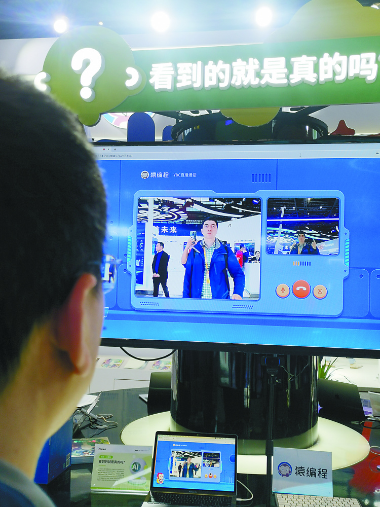 《环球时报》记者在“互联网之光”博览会上也感受了生成式人工智能可能带给普通人的安全风险。在一个聚焦青少年编程的公司展台,记者体验“看到的也未必是真实的”换脸揭秘实验。在机器前站几秒钟之后,AI就根据记者的外貌特征提供了两个换脸模型,一个是秒变“憨豆先生”,另一个是满脸大胡子。据展台工作人员介绍,这就是对青少年进行“换脸”风险的科普。