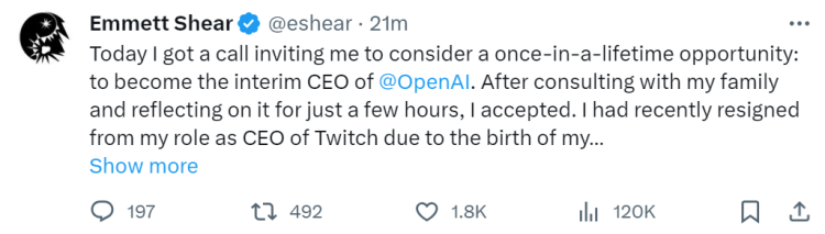 11月20日凌晨1点,亚马逊旗下游戏直播平台Twitch的前CEO埃米特·谢尔(Emmett Shear)也在X上发长文表示,在和家人商量并思考了几个小时后,自己将接受OpenAI的临时CEO一职。