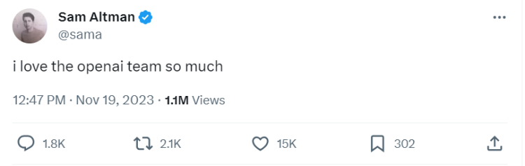 当晚,奥特曼在X上颇有深意地发文称:“我深爱着OpenAI团队。”许多OpenAI员工带着爱心符号转发了这条推文,包括布洛克曼、穆拉蒂和ChatGPT官方账号。