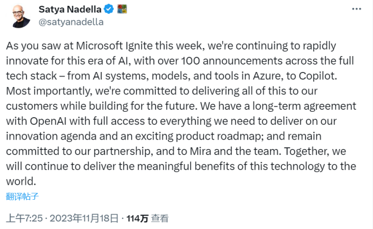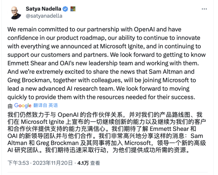 随后,微软CEO萨蒂亚·纳德拉(Satya Nadella)也在X上发文,表示微软将“继续致力于我们的合作关系,以及米拉和其团队”,但没有提及奥特曼的离职。有报道称,纳德拉在听到消息后表示惊讶和“震怒”。