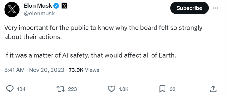 下午2点多,在网友质疑人们过于一致地支持奥特曼的推文下,曾与奥特曼等人一同创办OpenAI的埃隆·马斯克(Elon Musk)回复道:“非常重要的是,公众应该知道为何董事会如此坚决地做出决定。如果这关乎AI安全,那将会影响整个地球。”