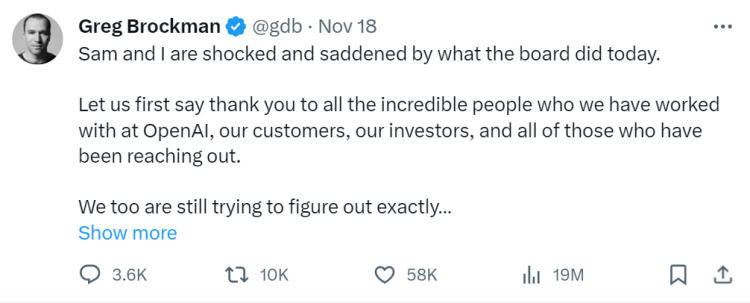 晚上8点,布洛克曼再次发文,梳理了两人被开除的经过,并表示自己和奥特曼对于董事会的所作所为感到“震惊和难过”,以及“更好的事情将发生”。奥特曼转发了这条推文。