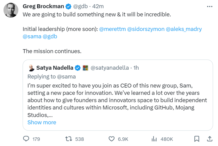 不久后,布洛克曼也转发了纳德拉的推文,写道:“我们将建造一些新的东西&它将是不可思议的。”