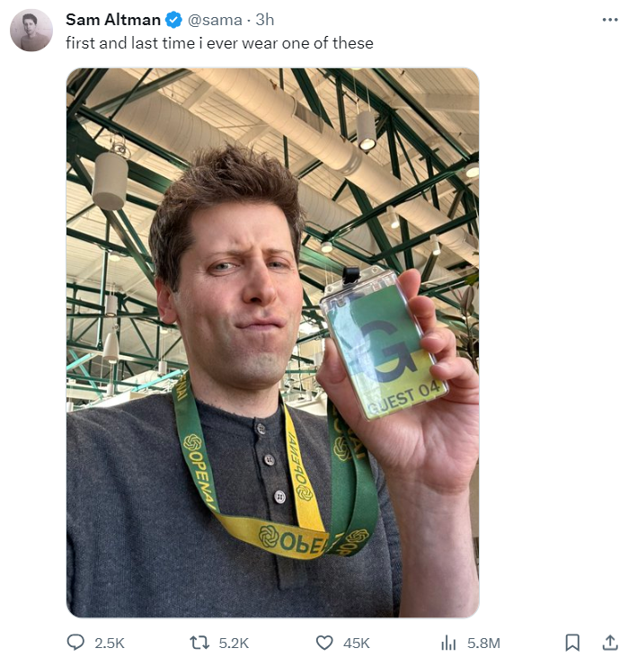 随后,奥特曼在X上晒出一张自己手持OpenAI访客卡的照片,并在配文中写道:“我第一次也是最后一次戴这种东西。”