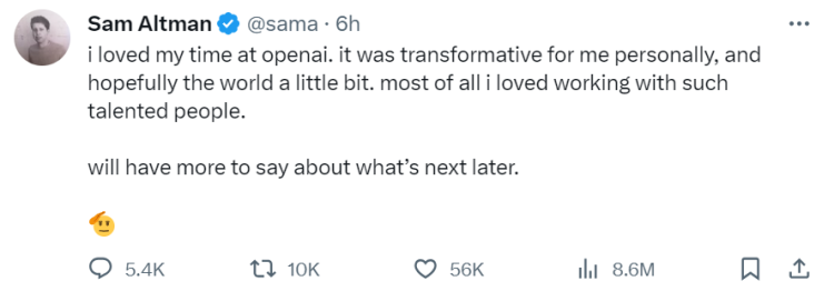 下午1点46分,奥特曼在X发文回应:“我很喜欢在openai的时光。这对我个人来说是变革性的,希望为世界也带来了一些变革。最重要的是,我喜欢与这些才华横溢的人一起工作。我将会宣布更多关于接下来的事情。”