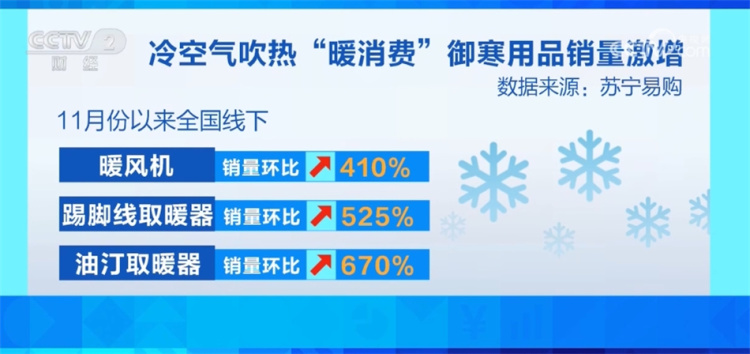 数据显示,11月份以来,某家电卖场全国线下暖风机销量环比增长410%,踢脚线取暖器销量环比增长525%,油汀取暖器销量环比增长670%。此外,某电商平台上,暖鞋器、发热围脖、水暖毯、电暖桌等新型取暖设备的销售额环比增长超过一倍。
