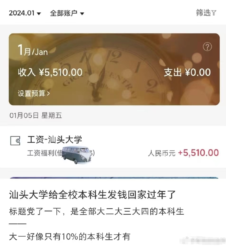 近日,网传汕头大学“给本科生发钱回家过年”,不少学生晒出银行卡账户收款截图,称“收到了学校的爱”,相关情况引发网友关注。