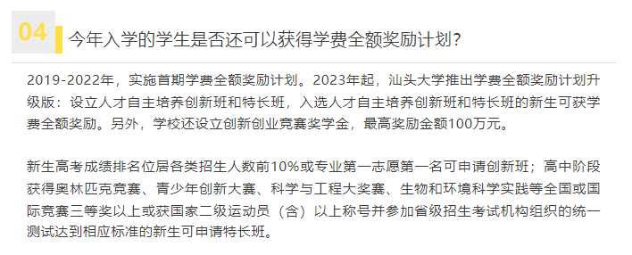 汕大招生表示,2023年起,汕头大学推出学费全额奖励计划升级版:设立人才自主培养创新班和特长班,入选这两个班的新生可获学费全额奖励。另外,学校还设立创新创业竞赛奖学金,最高奖励金额100万元。
