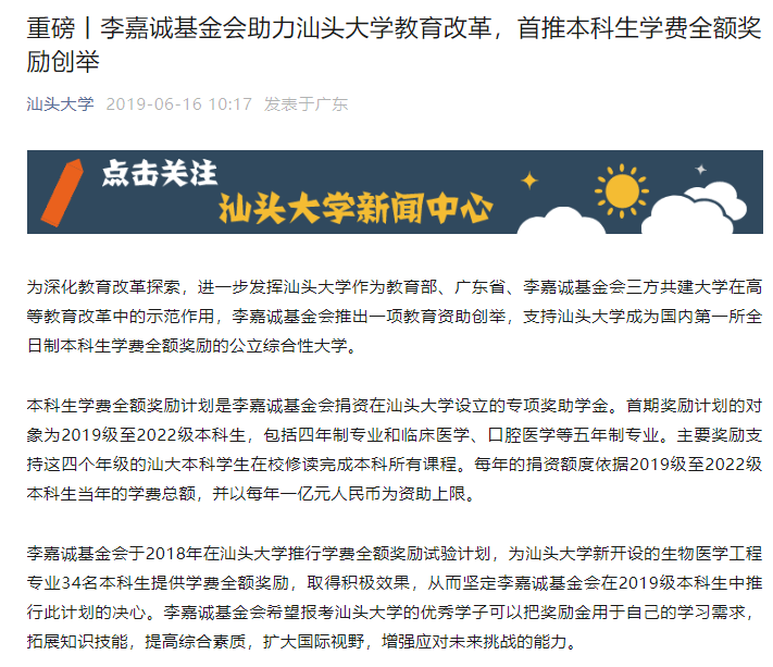 据汕头大学官方微信公众号介绍,本科生学费全额奖励计划是李嘉诚基金会捐资在汕头大学设立的专项奖助学金,支持汕头大学成为国内第一所全日制本科生学费全额奖励的公立综合性大学。