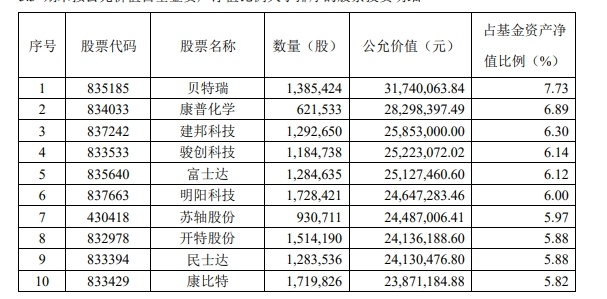 整体来看,四季度末,前十大重仓股依次为贝特瑞、康普化学、建邦科技、骏创科技、富士达、明阳科技、苏轴股份、开特股份、民士达、康比特。
