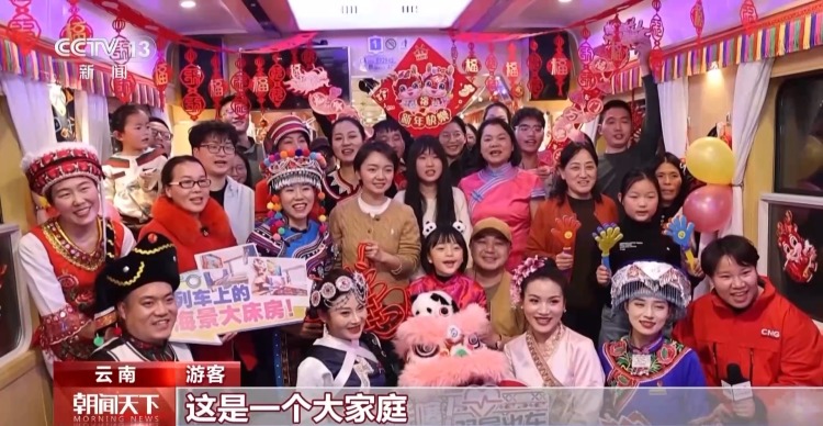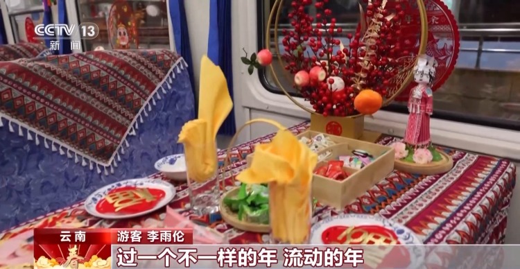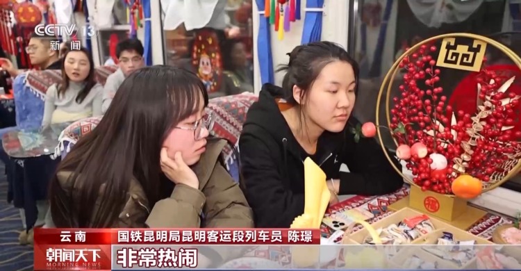 国铁昆明局昆明客运段列车员 陈璟:以前过节,车上基本上旅客都没有工作人员多,现在不一样了,非常热闹。刚刚我还拍了几张照片发我父母,他们看了以后觉得,车上的年味比家里边的还浓。