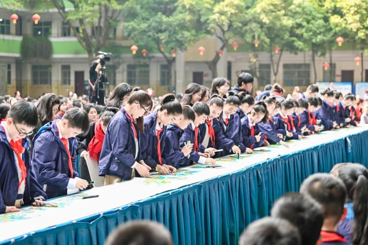 最令人印象最深刻的当属全校师生共绘《千里江山图》。在巨大的画布上,孩子们手持画笔,蘸取颜料,认真描绘着心中的祖国山河。他们用笔触勾勒出峰峦叠嶂、江河奔流的美景,将对家国的眷恋与对未来的期许融入其中。教师们也纷纷加入,师生之间相互协作、互相鼓励,共同完成了这幅令人震撼的《千里江山图》。