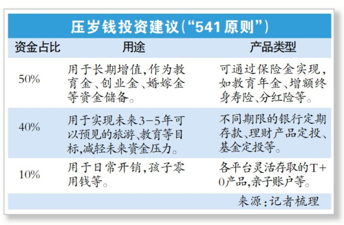业内人士指出,“压岁钱”是长辈对孩子美好的新年祝福,可根据实际情况进行规划。通过科学理财,一方面可以获得稳健收益,另一方面还可从小培养孩子的财商。
