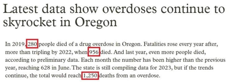 而根据美国疾控中心数据,全美吸毒过量致死人数2023年接近11万人,同比增加0.7%;而其中,俄勒冈州的吸毒过量致死人数同期却激增11%。