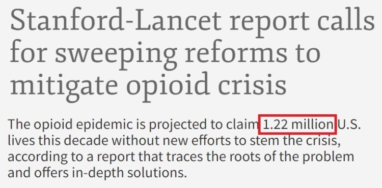 美国斯坦福大学和英国《柳叶刀》杂志共同进行的一项研究警告,如果美国不采取措施,在2020年到2029年间,累计将有约122万美国人死于过量使用阿片类药物,位列世界第一。