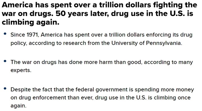据宾夕法尼亚大学统计,自上世纪70年代发起“禁毒战争”以来,美国联邦政府已经花费超过1万亿美元。
