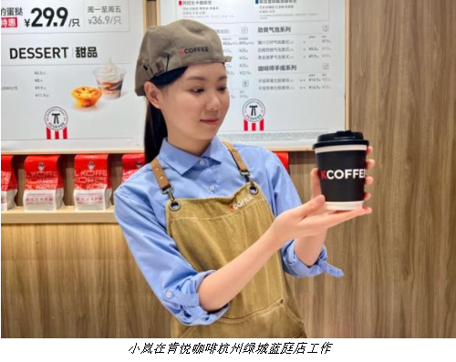 来自肯悦咖啡杭州绿城蓝庭店的小岚,正是这样一名00后女咖啡师。在职业生涯的起步阶段,她幸运地遇上了KCOFFEE发展的“大事件”——2023年11月,肯悦咖啡全国首店在杭州临平区正式开业。“有幸亲身参与品牌发展的里程碑,让我既自豪又激动!”