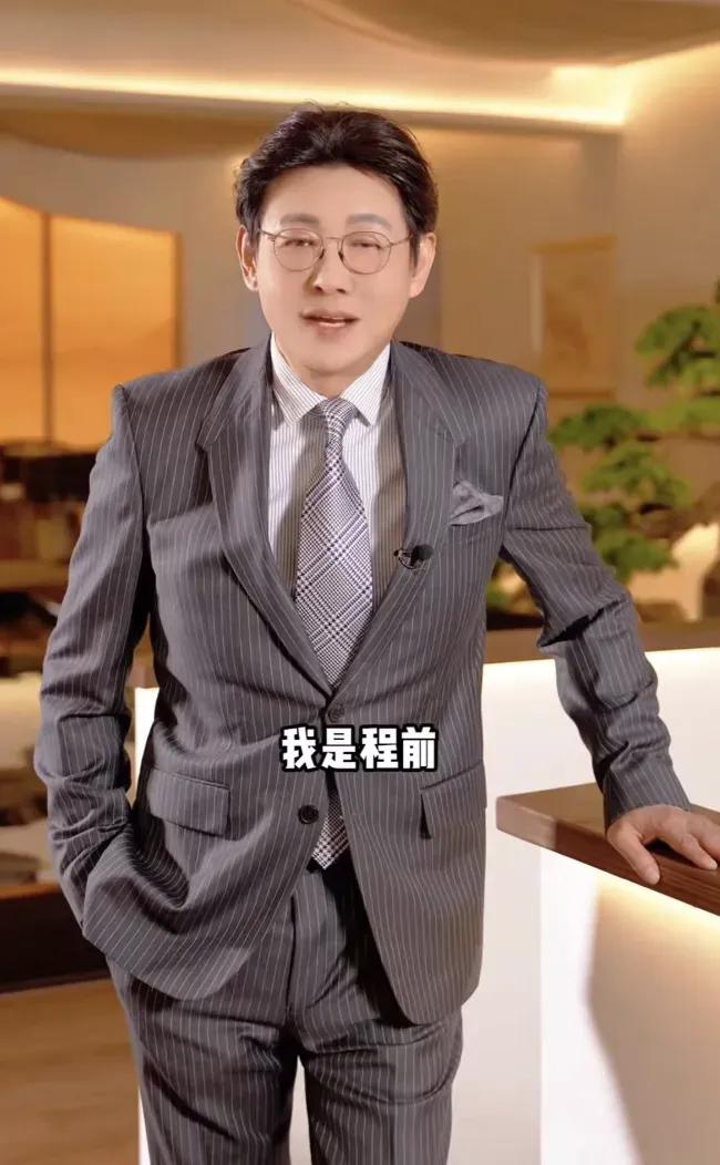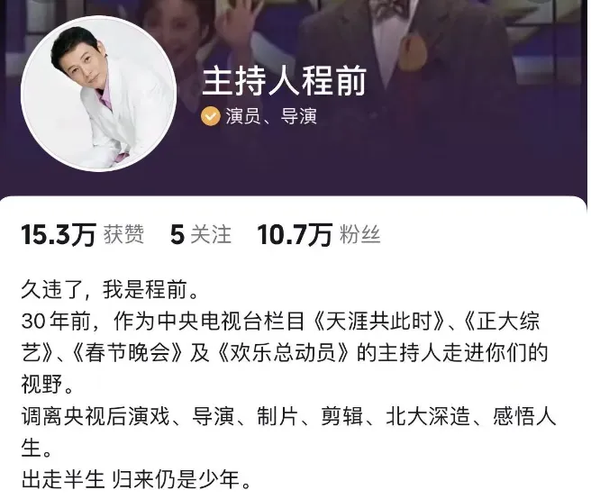 他的账号简介显示:久违了,我是程前,30年前,作为中央电视台栏目《天涯共此时》《正大综艺》《春节晚会》及《欢乐总动员》的主持人走进你们的视野。调离央视后演戏、导演、制片、剪辑、北大深造、感悟人生。出走半生,归来仍是少年。