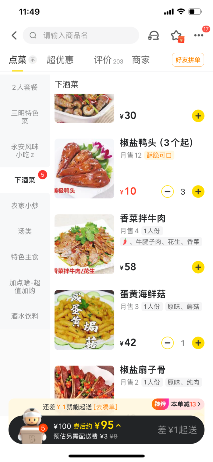 记者进入该店铺,发现共有50余种菜品和饮料,价格从几元至几十元不等。记者在该店铺下单3份小吃(其实是5份,其中一款要求3份起购)页面显示83元,差18元起送。之后又下单3份下酒菜(其实是5份,其中一款要求3个起购),页面显示100元(打包费尚未计入),仍差1元起送。无奈之下,记者再点了一份3元米饭,外卖页面方提示去结算。