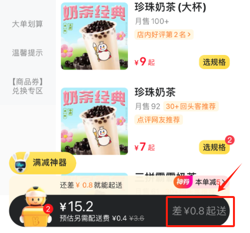 个别商家没有设置起送价格,这些商铺要么所有商品单价均较高,要么对商铺内的低单价商品标注“单点不送”。