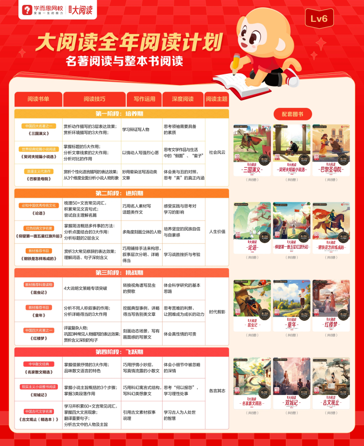 为此,学而思大阅读为青少年打造了从阅读到创作的全年提升计划,邀请来自北大中文系的学者等阅读专家精选古今中外必读名著书单,并根据内容理解的难易程度分为六个等级。其中,为贴合儿童阅读体验,学而思大阅读将名著科学地拆分成册,让孩子能够读得轻松,并且附带了配套情节导图,让孩子记得更牢。