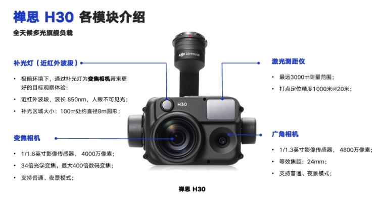 但大疆行业现在认为,禅思H20系列负载还不够好,认为其可见光观测能力与夜视能力还不够兼顾,各种设备的集成度还不够高,所以全新的禅思H30系列应运而生。其产品经理表示,禅思H30系列的功能、性能都有全面的提升,做到了白天、夜视、红外的“面面俱到”,同时其尺寸、重量、成本也都控制得很低,实现了业界的新突破。
