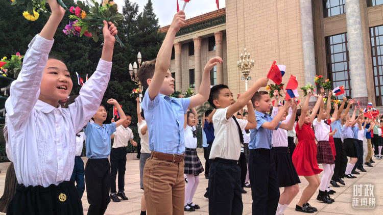 现场有两个特殊的安排。一个是军乐团的演奏曲目。军乐团选取了《莫斯科郊外的晚上》作为迎宾曲。另一个是少年儿童欢迎群体。仪式现场除了中国小朋友,在华的俄罗斯小朋友也来参加活动。这些周到细致的安排,传递的是世代友好的情谊。