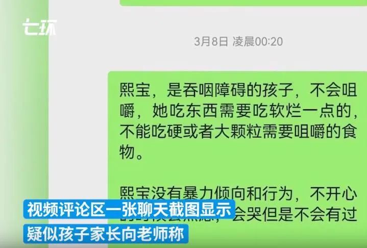 网曝聊天记录显示,疑似家长曾向老师讲过孩子存在吞咽障碍。