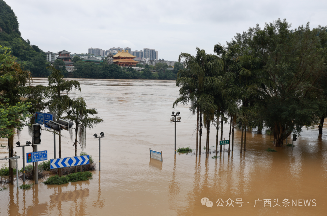 目前,受洪水影响,柳江边的部分区域已经被洪水淹没。