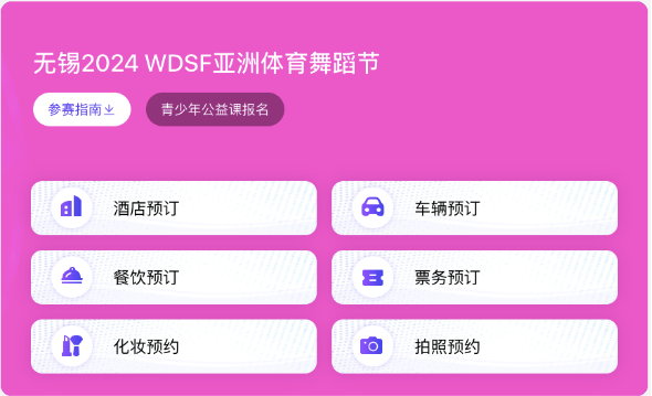 所有参赛人员都可在此平台上,完成舞伴配对、一键选组、报名缴费、酒店交通预定、妆发服务预定、门票购买、比赛多媒体素材获取等操作,不仅大大减少了主办方在赛事组织运营过程中的人力投入,提高信息传递的效率和信息收集的准确度,同时,也将大幅提升参赛人员的全流程赛事体验。