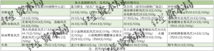 在四大商超中,鲜鸡爪价格普遍在28元/500g左右,贵一点的每斤逼近40元,如永辉超市(成都399购物中心店)的鲜鸡爪就是39.9元/500g,沃尔玛(成华SM购物广场店)中来自湖南的湘佳牌鸡爪每斤也超过35元。至于冻鸡爪,四大商超的价格每斤在15元-20元这个区间内。