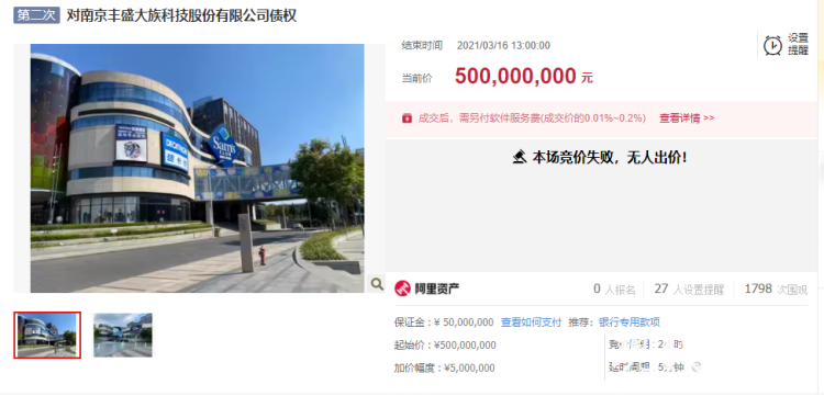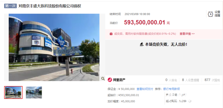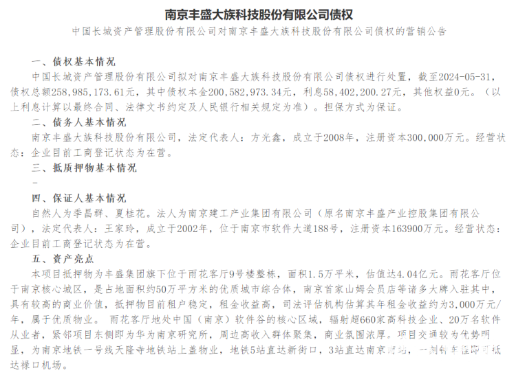 7月25日,现代快报记者从阿里资产交易网上了解到,位于雨花客厅E-park商场南区的9号楼将被处置。相关网页显示,中国长城资产管理股份有限公司拟对南京丰盛大族科技股份有限公司债权进行处置,截至2024年5月31日,债权总额约2.59亿元,其中债权本金超2亿元,利息0.58亿元。这笔债权的抵押物为丰盛集团旗下位于雨花客厅E-park商场南区的9号楼,面积1.5万㎡,估值达4.04亿元。现在2.59亿元处置,相当于打6折。