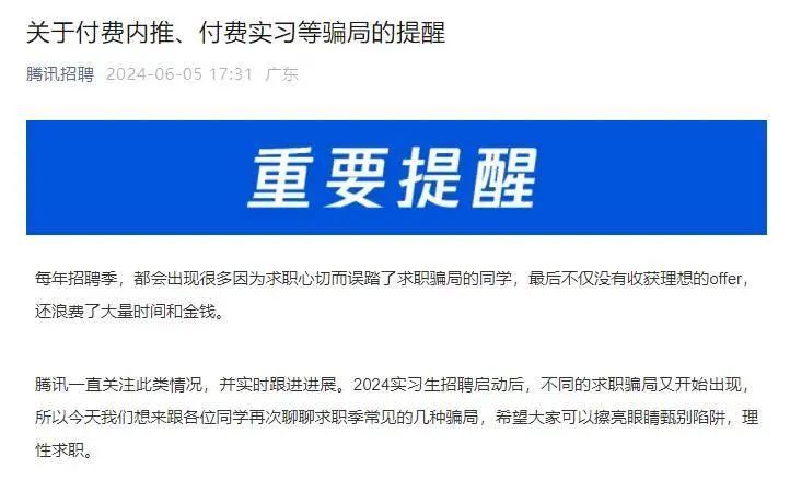 “我们不断发现有非法求职机构/求职类公众号/个人发布付费实习的相关信息,号称只要支付中介费就可以拥有一段实习经历,但实际上这类岗位都是虚假岗位,同学们获得的所谓实习证明也是虚假证明,甚至证明上加盖的印章都是伪造的。”今年6月5日,腾讯集团发文提醒,并强调,“腾讯的所有实习岗位均不存在收费的情况,并且对此类行为严令禁止,所有付费才能实习的岗位均为虚假岗位,属于诈骗信息。”