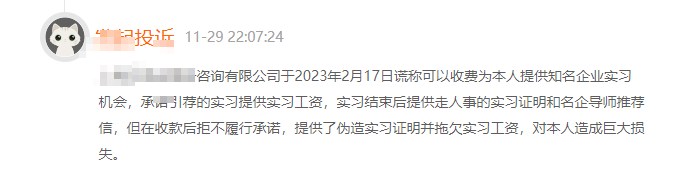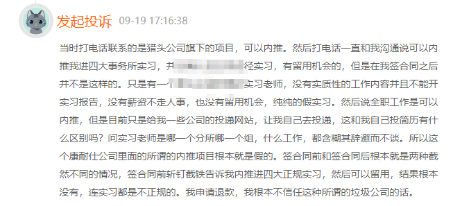 记者以“内推”为关键词在黑猫投诉平台检索发现,目前,有超过4700条相关投诉,其中55条涉及“内推实习”。比如,有人投诉一家猎头公司称可以内推到四大会计师事务所实习,且有留用机会,但付费48000元后,却发现这份实习既没有实质工作内容,也无法提供实习证明。还有人投诉称,上海某公司谎称可内推知名企业实习机会,收款后却仅提供伪造的实习证明,涉诉金额超4万元。
