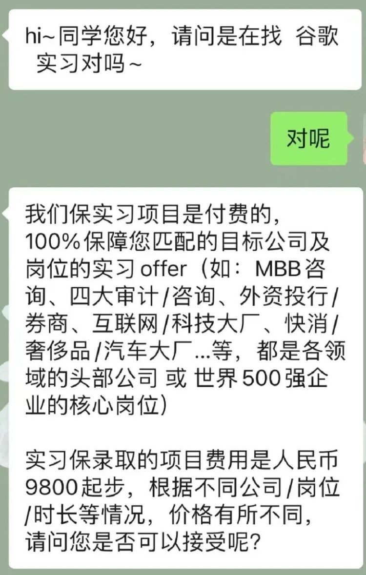 大学生陈悦找实习时,则遇到一家求职机构宣称:“提供保录取的实习项目,100%保障匹配的目标公司及岗位的实习offer,费用9800元起步。”